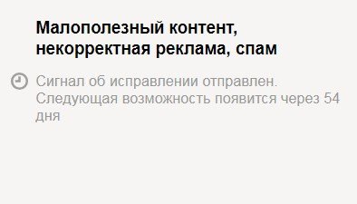 Работа кнопки осуществляется в случаях обнаружения на сайте нарушений, связанных с поисковым спамом (например, Баден-Баден, Минусинск, Дорвей и т.д.). При проблемах с безопасностью сайта (например, при присутствии на нём вредоносного кода, программ-оберток и любого другого содержимого, которое может угрожать безопасности пользователей) также доступна кнопка "Я всё исправил", но работает она иначе.