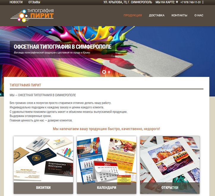 - Простая главная страница с полным ассортиментом типографии (печать визиток, календарей, открыток, блокнотов и так далее) с полной информацией;